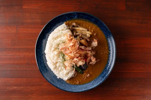 「和風だしカレー」は、鶏がらと魚介だしを使ったオリジナリティあふれるカレー。味わいはアッサリしていて、優しく軽い後味。花かつおや揚げナス、きのこなどとの相性が抜群です。