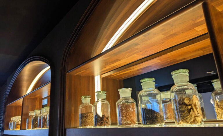 店内には23種類のスパイスがディスプレイされ、重厚感のあるカウンターが特徴的。まるでオーセンティックバーにいるかのような“隠れ家空間”で、スパイスの香りとともにゆったりとした時間を過ごせます。
