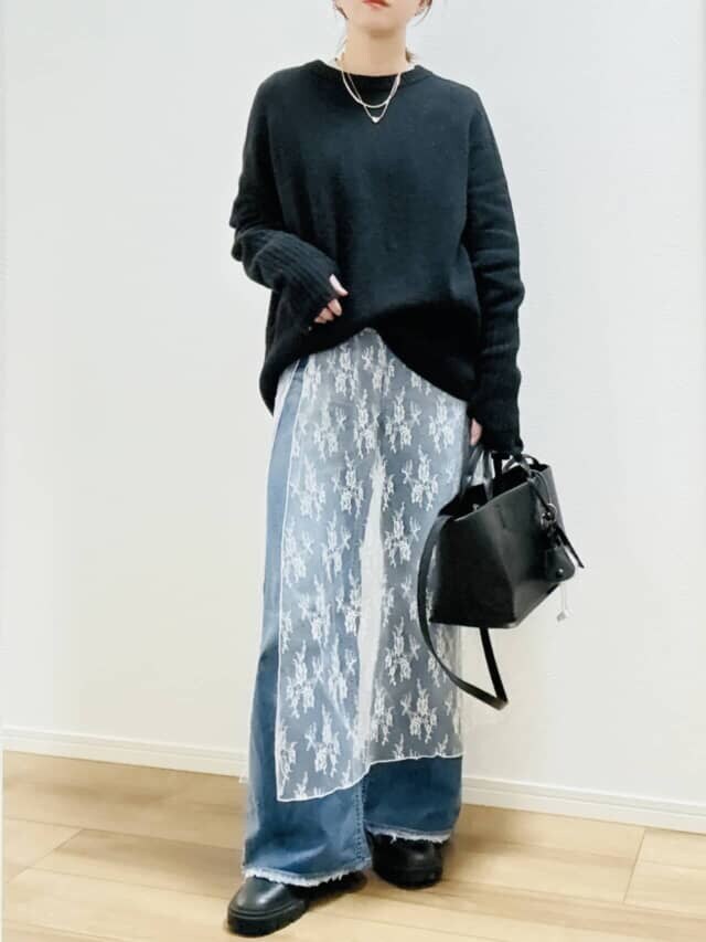 40代は甘さを足すより、引き締め役とセットで使うのが正解。黒ニット×デニムに白レーススカートを一点投入するだけで、繊細さと大人の落ち着きが共存。レザーやスウェットなど辛口アイテムと合わせると、今っぽさがより際立ちます。