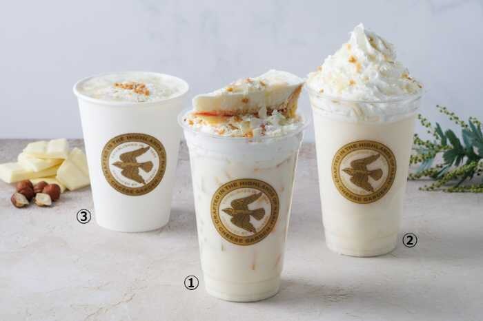 パフェのようなビジュアルが楽しめる「ホワイトショコラレアチーズケーキドリンク」、香ばしいヘーゼルナッツとホワイトショコラが溶け合う「ホワイトショコラフローズンフロマージュ」、温かくまろやかな甘さが広がる「フロマージュホワイトショコラ」の3種類。