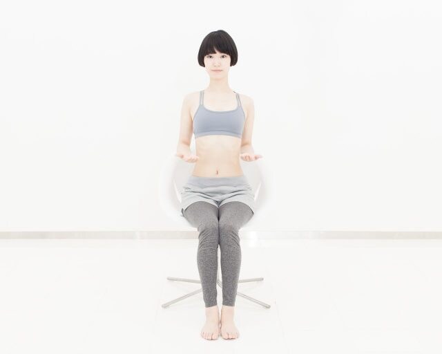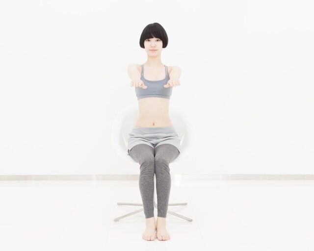 (1)背筋を伸ばして浅く椅子に座り、手のひらを真下に向けたまま肩の高さで腕を真っ直ぐ前に出す