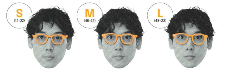 同じモデルでも、レンズ幅が2mmずつ違うだけで印象は異なる。なお、黒目の位置として最適なのはレンズの中心ではなく、レンズの中心から若干内側と上側にずれるのが理想。これは、人間の視野は鼻側より耳側、上側より下側のほうが広いからである。