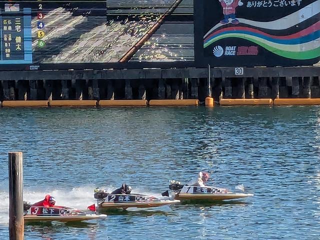 そうはいっても、向かうのは競艇場。フェリー乗り場のバス駐車場沿い、新設の遊歩道からコースの第1マークが間近で、大迫力のターンが眼前で展開する。うぅ、早く打ちたい。