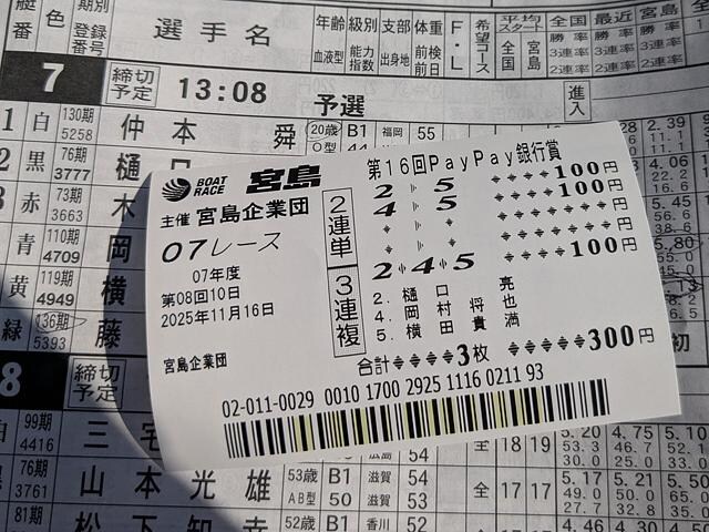 ならばと7RはA級B級混合予選のA級選手のみ選んで2連単②④、②⑤と3連複②④⑤と買うと、なんと本日初投票から的中! 2連単は②⑤1180円、3連複は1番人気で340円だが、払戻1520円なら今日は赤字で終わることはないだろう。