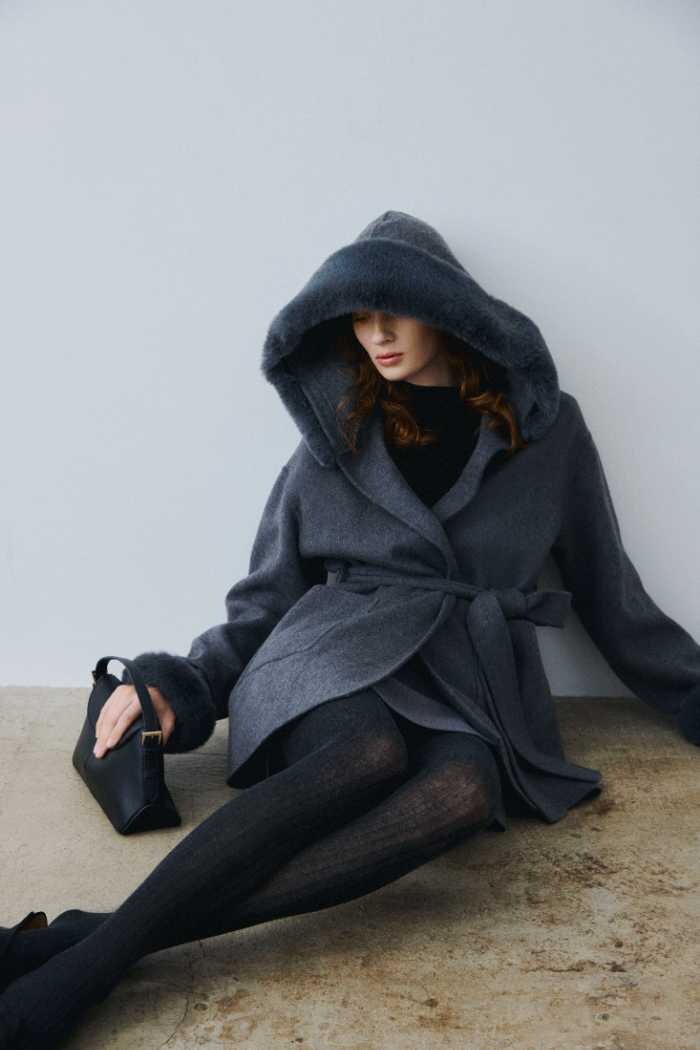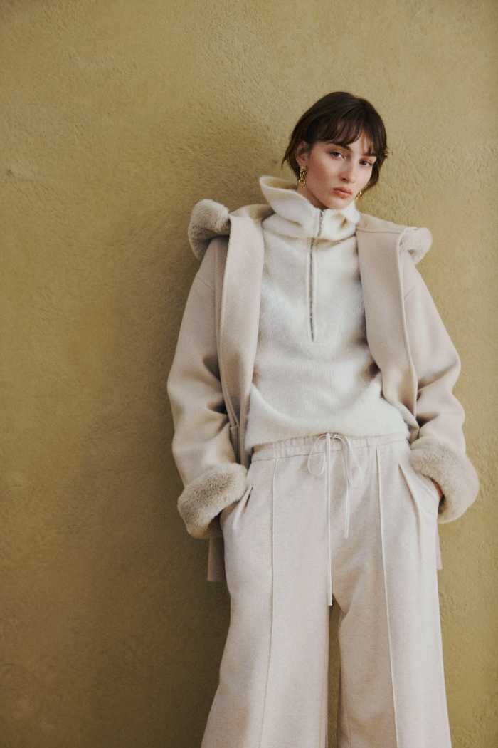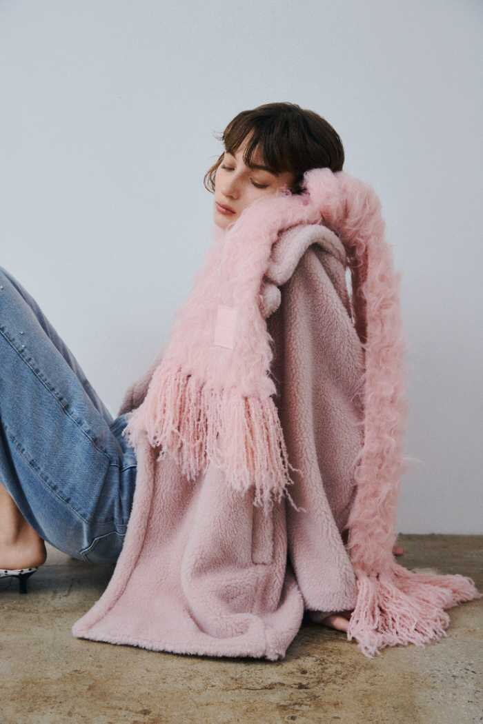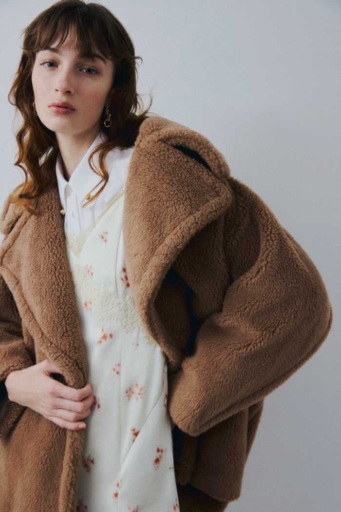 「ECOPELボアミドルコート」(44,990円)はふんわりしたコクーンシルエットが特徴。