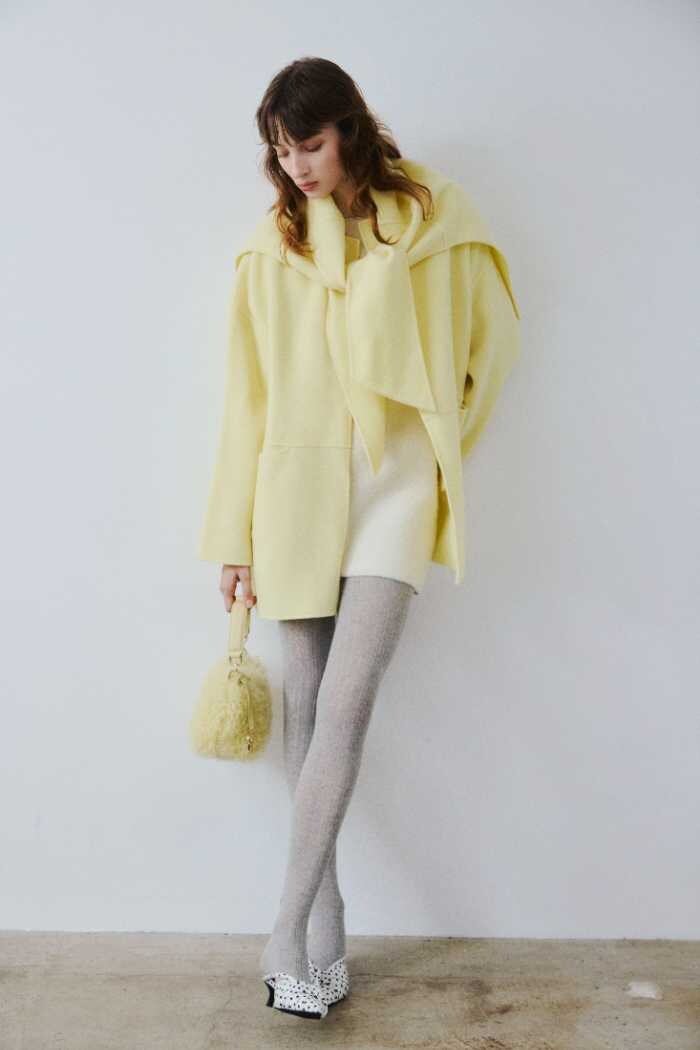 「ECOPELショートファーコート」(27,500円)はリアルな質感のエコファーを採用。ベーシックカラーに加え、遊び心あるイエローも展開。どちらもsize0・1、WHTやBLKなどカラーも豊富です。