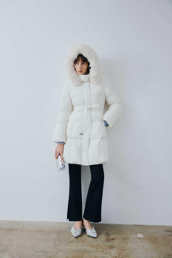 「フードファーロングダウンコート」(48,400円)はウエストシェイプ仕様で美シルエットに。防寒性も抜群です。