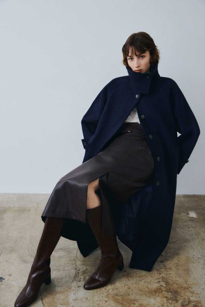 「バルマカンロングコート」(53,900円)は2WAYスタンドカラーでアレンジ可能。