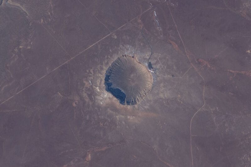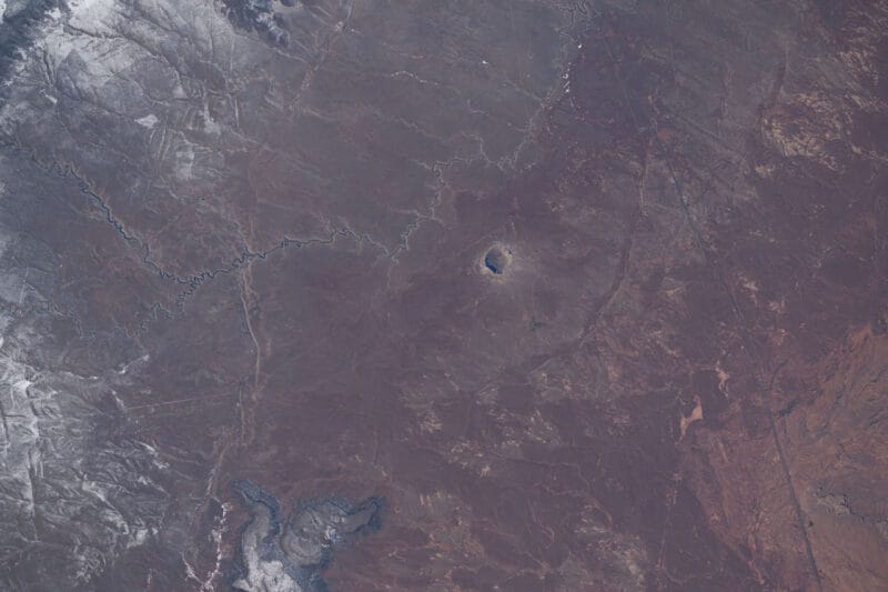 この画像はISS(国際宇宙ステーション)から撮影されたもので、中央付近にメテオール・クレーター(バリンジャー・クレーターとも呼ばれます)が映っています。メテオール・クレーターは、アメリカ、アリゾナ州にある直径約1.2kmの衝突クレーターです。約5万年前の隕石衝突によって形成されました。