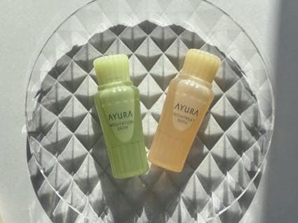 アユーラ「メディテーションバス t(J)」(画像左 50mL/616円)、「ナイトリートバス(J)」(画像右 50mL/638円)は、2層タイプの液体入浴料。