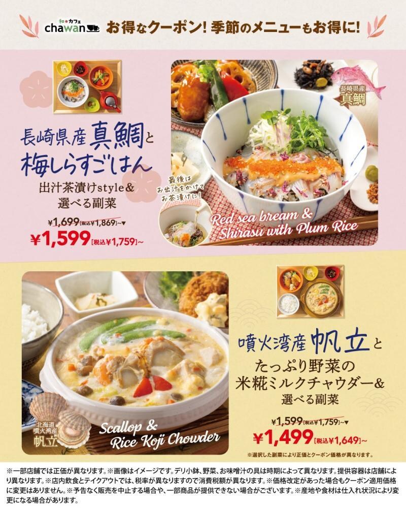たとえば、「長崎県産真鯛と梅しらすごはん 出汁茶漬けstyle&選べる副菜」と「噴火湾産帆立とたっぷり野菜の米糀ミルクチャウダー&選べる副菜」、「選べる3種の惣菜和膳」は各110円引きに。