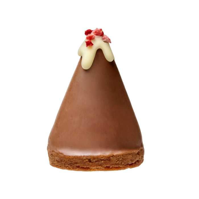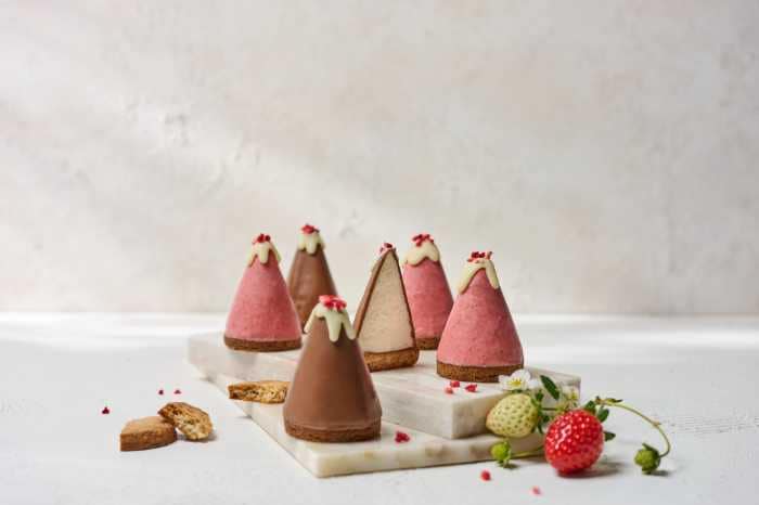 山型フォルムのてっぺんには、ホワイトチョコレートとフリーズドライ苺をトッピング。パリッとしたチョコレートの中からとろけるクリームが溢れ出し、サクサクのサブレと重なる食感が魅力です。
