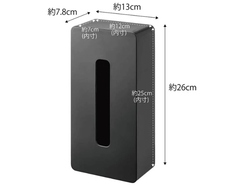 商品の外寸は約W13×D7.8×H26㎝、内寸は約W12×D7×H25cm。高さ約7cmまでの標準的なサイズのティッシュボックスを入れることができます。