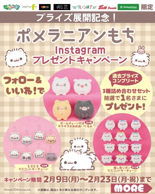 限定プライズ用景品の展開を記念し、モーリーファンタジー公式X・Instagramでは、「ポメラニアンもち 過去プライズ3種詰め合わせセット」が抽選で各1名さま、に当たるSNSキャンペーンを開催いたします。詳細は公式アカウントをご確認ください。