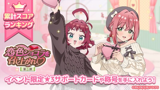 2月9日(月)よりイベント「恋色ショコラを召し上がれ(ハート) 第2弾」を開催いたします。当イベントでは、イベントマップで集めたポイントで、ピックアップガチャチケットやイベント限定の★3サポートカードが獲得できるポイントガチャも登場します。繰り返し挑戦して報酬を手に入れよう!