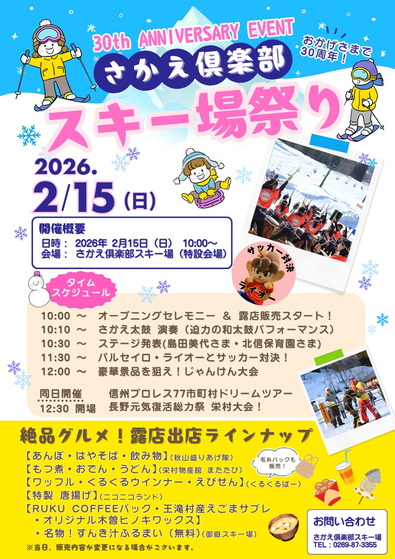 さかえ倶楽部では今シーズン、開業30周年を記念し、2月15日(日)に「スキー場祭り」を開催予定。じゃんけん大会では、なんと「30年有効シーズン券」が登場するという。20周年記念の際には、20年券が栄村民に当たったそうだ。