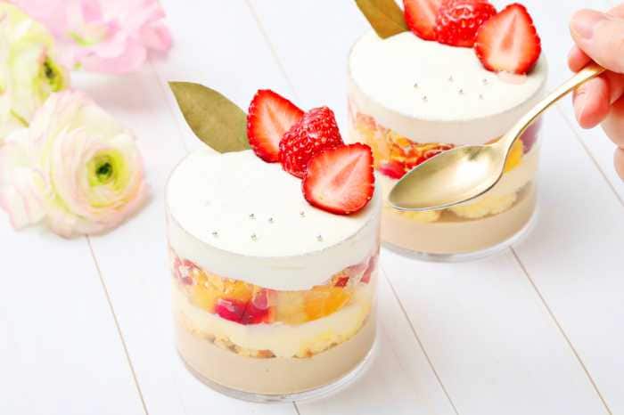 黒糖風味のパンナコッタに、スポンジとディプロマットクリーム※2を重ね、苺やオレンジ、グロゼイユを華やかにサンドしました。