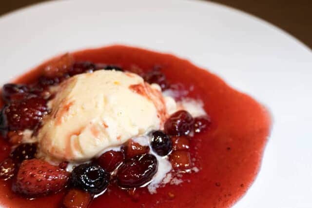こちらもライブキッチンのイチ押しスイーツ。大きなフライパンでいちごやベリーを熱し、炎を上げるブランデーをかけてフランベしたソースをアイスクリームに注ぎます。冷たいアイスと温かい果実が絶妙の美味しさ。スイーツブッフェでは日に4、5回フランベが行われるので、見て楽しんで、熱々を食べて楽しめます。