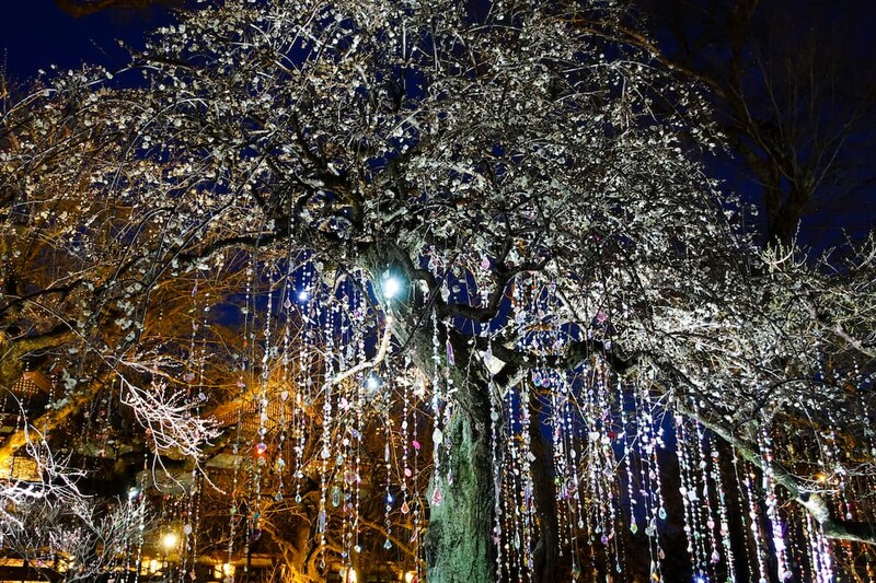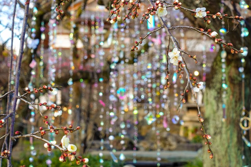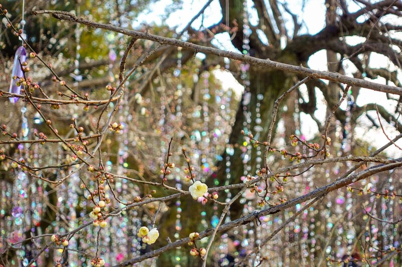 梅苑の木々に吊り下げられた約1,200本のクリスタルは、すべて手作業でつくられ、1本ごとに並び順までデザインされた、蜷川氏の想いが込められた渾身の作品となっています。これまでの作品と同じものは一切使わず、すべて北野天満宮のためにつくられた特別なクリスタルなのだそう。