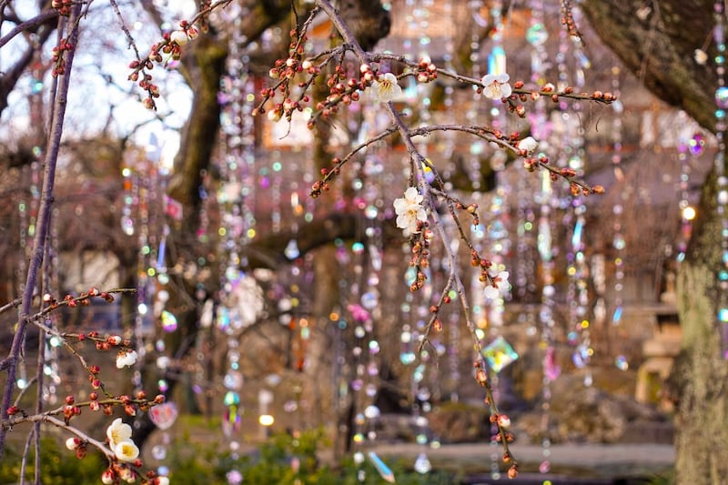 時間帯や天候、そこに梅の開花が重なることで異なる表情へと変化します。昼には透明感のある光の庭としてきらめき、夕陽を受ければ淡いピンクに染まり、夜になると星空のような輝きへと姿を変えるそのさまは、季節のうつろいとともに新しい美しさを見せてくれます。