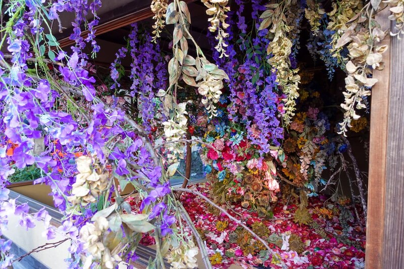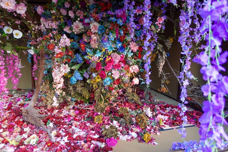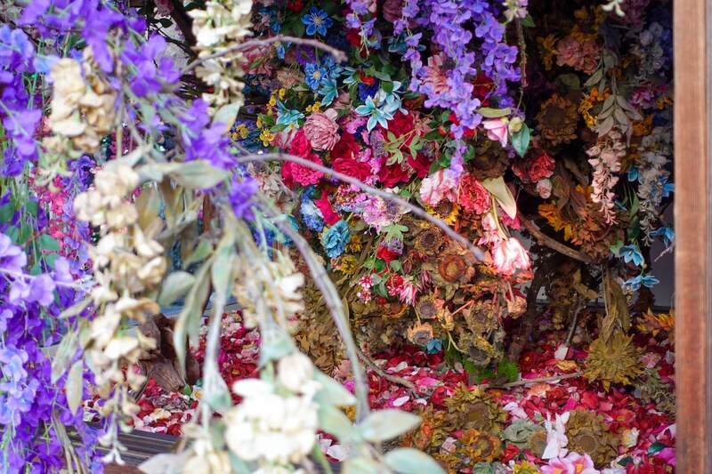 同作品は全て造花で作られており、市販では手に入らない“枯れた造花”までも一つひとつ手作りされている点が印象的。華やかさと静けさ、生と死といった相反するものが同じ空間にやさしく共存しています。