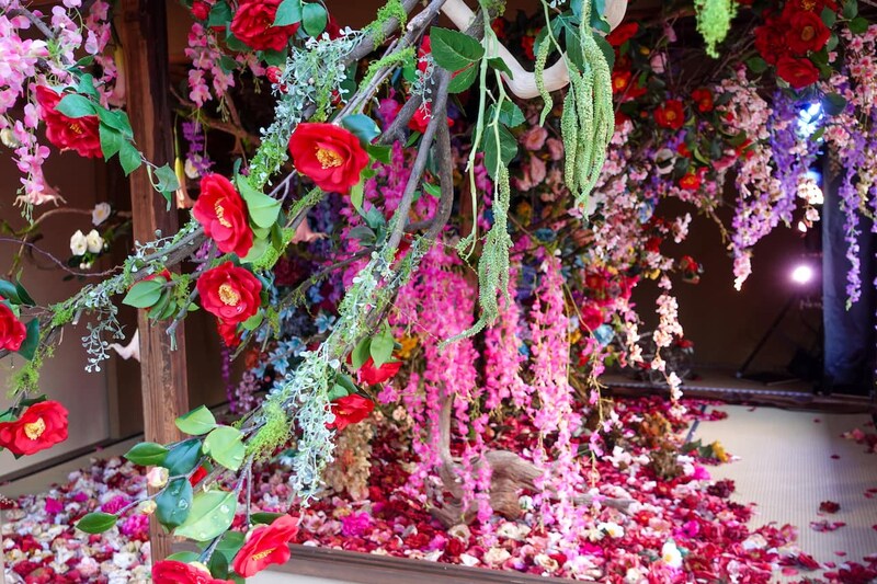 蜷川氏がこれまでも手がけてきたシリーズ《残照》。「今回が最高傑作。北野天満宮という場所の力を借りてやっと完成した」と語るほど、この地での展示に強い想いを寄せています。茶室の内部に咲き誇る花の中には、あえて枯れた状態を再現したものも。咲き誇りながら枯れて落ちていく光景は、いのちがめぐる時間の流れを表現しているのだそう。