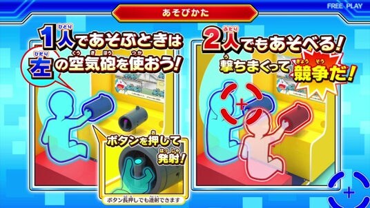 空気砲型のガンコントローラを使用し、ボタンを押すと振動とともにドラえもんやのび太の「ドカン!」と叫ぶ声が聞こえ、まるで空気砲を撃っているような感覚でプレイすることができます。