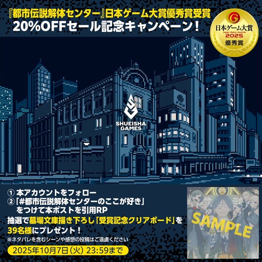 株式会社集英社ゲームズ(本社:東京都千代田区、以下「集英社ゲームズ」)は、『都市伝説解体センター』が「日本ゲーム大賞2025」において優秀賞を受賞したことを記念し、全プラットフォーム初の20%OFFセールおよび墓場文庫描き下ろし「受賞記念クリアボード」が当たるキャンペーンを開催することをお知らせいたします。その他、オーディオドラマやクリエイターコラボPOP UP SHOP、コラボカフェについても発表いたしました。