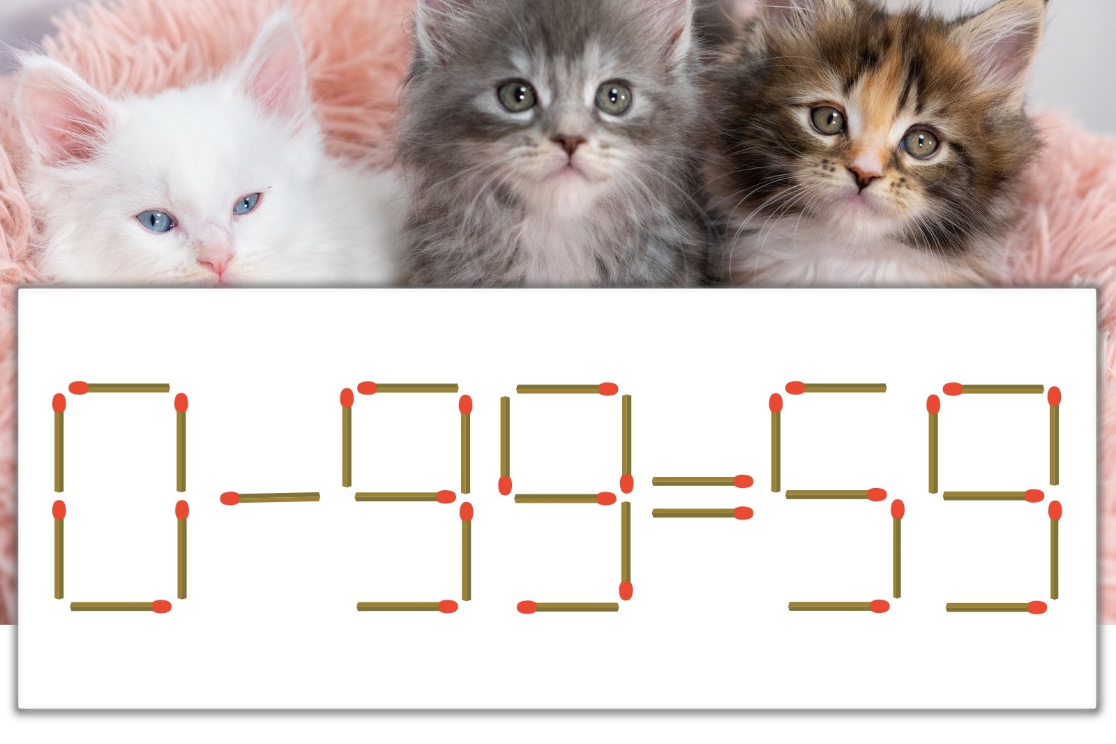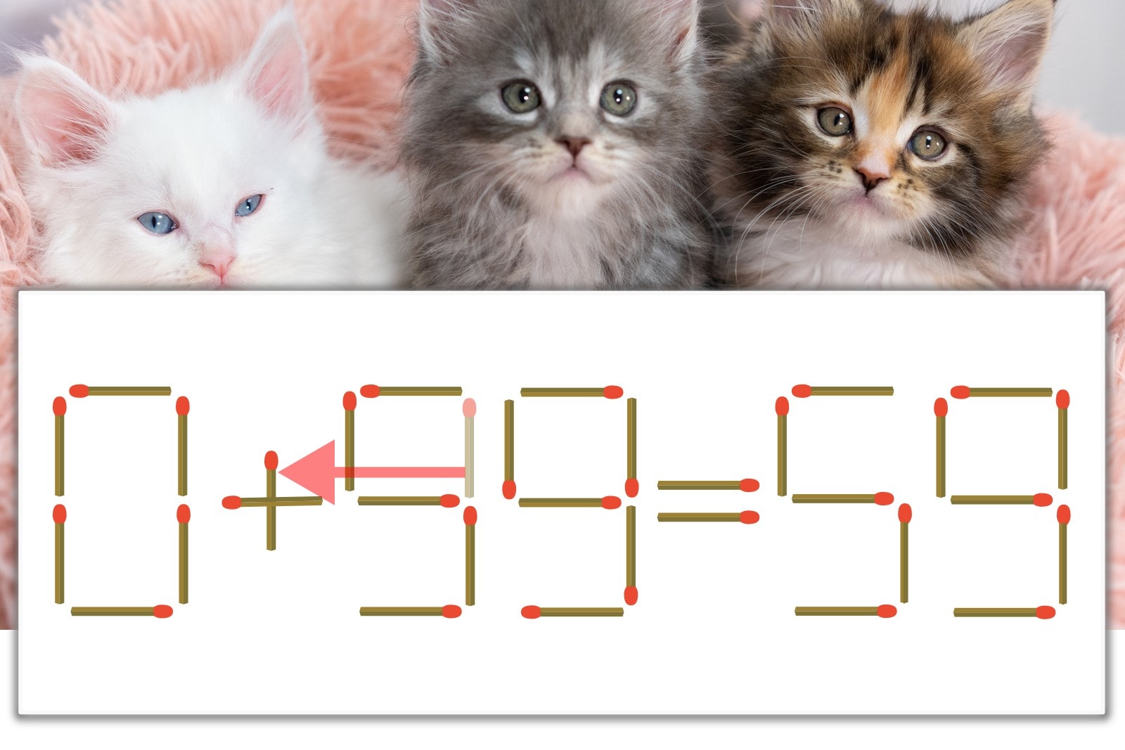 「9」を別の数字に変化させると答えが導き出せます。十の位の「9」のマッチ棒を1本移動して、「-」を「+」にしてみましょう。すると、「0+59=59」が成立します。