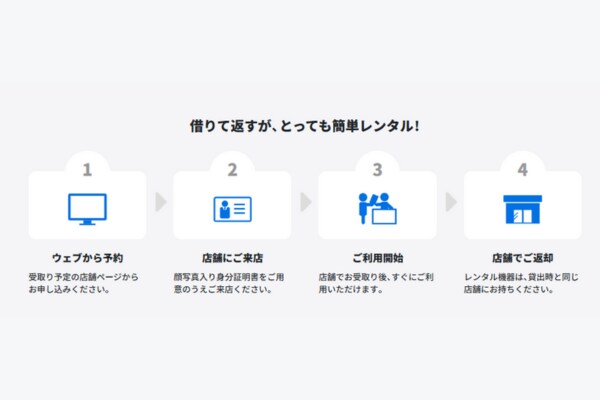 急な出張や旅行、テレワークなどで「今すぐWi-Fiが必要」というニーズにお応えし、WEBでご予約後、すぐに予約した店舗でお受け取りいただけます。