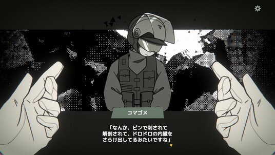 アドベンチャーパートでは、ディストピア世界に暮らすさまざまな悪人たちと対峙します。ギャングのヘッドを務めるウニ、自分をキャビネットと信じるカルト宗教の狂信者など、登場するキャラクターは個性豊かな曲者揃い。ゲーム画面には常に主人公自身の「手」が映り込み、鮮やかなアニメーションで彼らとの対話を彩ります。