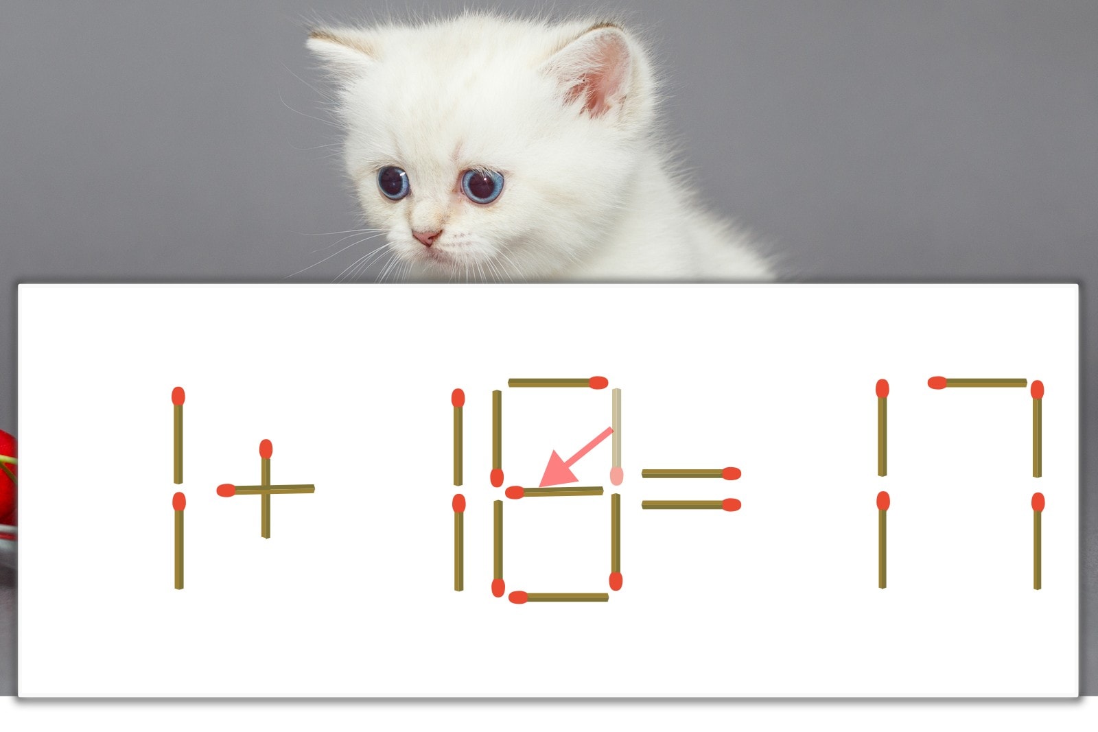 「0」を別の数字に変化させると答えが導き出せます。「0」のマッチ棒を1本移動して、「0」を「6」にしてみましょう。すると、「1+16=17」が成立します。