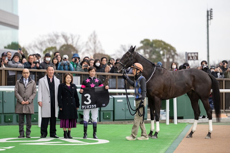 武豊騎乗の5番人気、テリオスララの鮮やかな逃げ切りが決まった。道中は2馬身ほどのリードで主導権を握るマイペースの逃げを展開。終始手応えは良さそうで、長い直線でも坂を駆け上がってからも脚色は衰えず、粘りに粘って2着以下を半馬身振り切って、まんまと押し切った。