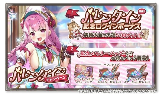 「美術大全の欠頁」を最大×30獲得できるログインボーナスや、期間中、エントランスで設定したキャラクターおよび執務室のサンソヴィーノにおいてバレンタイン期間限定のボイスをお楽しみいただけます。
