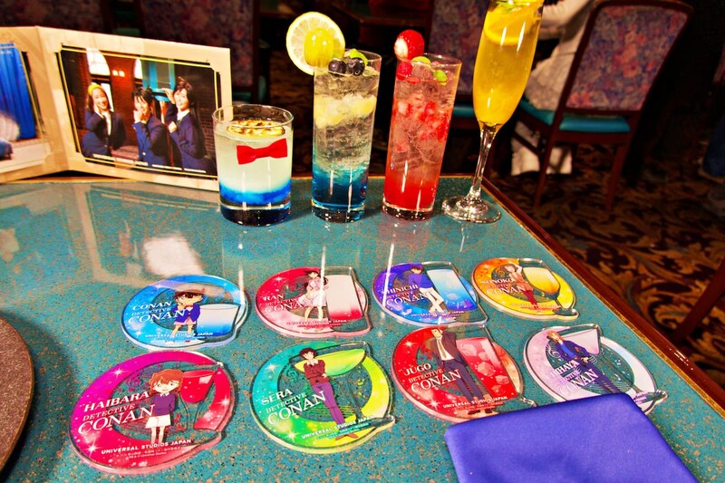 ドリンク写真左から「江戸川コナン レモン・ホワイトウォーター」、「工藤新一 アップル&ライムモヒート」、「毛利蘭 ストロベリーソーダ」、「鈴木園子 オレンジ&マンゴーソーダ」