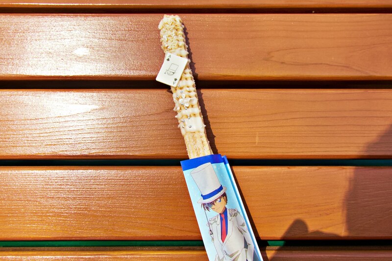 同じくカリフォルニア・コンフェクショナリー前のフードカートで販売されていたのは、ホワイトカラーにゴールドがきらめく「怪盗キッド・チュリトス~ホワイトグレープ味~(850円)」。キッド様のようにエレガントな見た目とさっぱりした甘さで、歩きながら楽しむのにぴったり。おなじみの予告状付きなのもうれしいですね。
