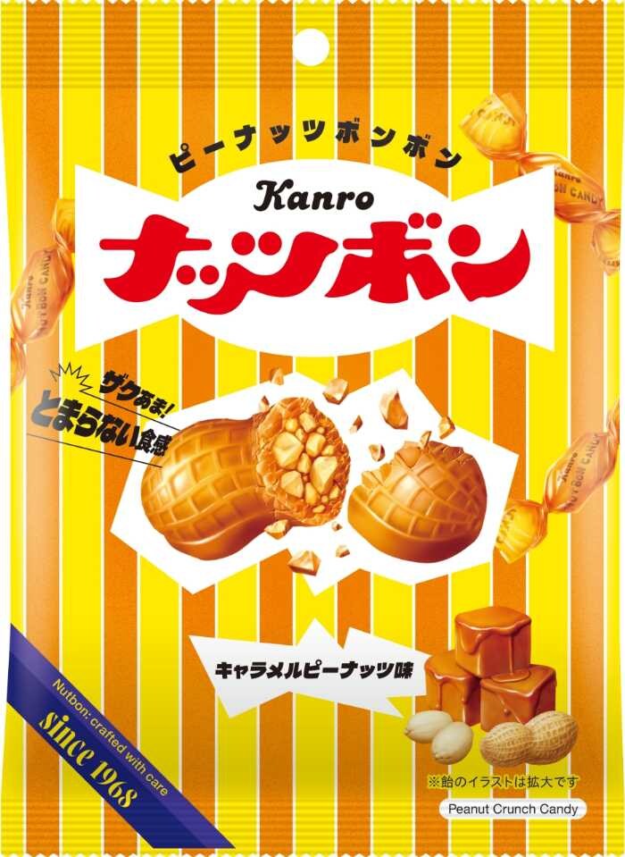 カンロから、香ばしいキャラメルピーナッツ味の「ナッツボンキャラメルピーナッツ味」が登場♡1968年に誕生したナッツボンの復刻版として、ザクザクの食感と甘いキャラメル風味をさらに追求。レトロかわいいパッケージに包まれたキャンディは、コーヒーやティータイムにもぴったりです♪