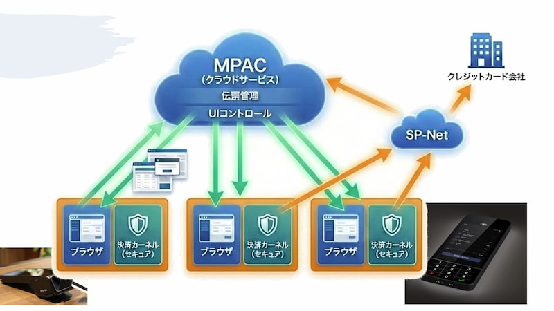 MPACでは、端末上で動作する機能をあえて二つに絞っている。一つは、接客サービスを提供するクラウドサービスを表示し、利用者の入力を受け付けるためのブラウザ機能。もう一つは、クレジットカードと決済ネットワークを直接接続し、セキュアな決済を実現する決済機能。