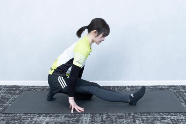 (2)脚の付け根を曲げるイメージで上半身を前に倒して10〜15秒間キープする
