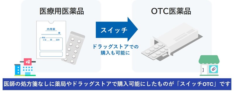 「スイッチOTC」とは、これまで医療機関でのみ処方されていた医療用医薬品の成分を、薬局・ドラッグストアで購入できる市販薬(OTC医薬品)に転用することです。