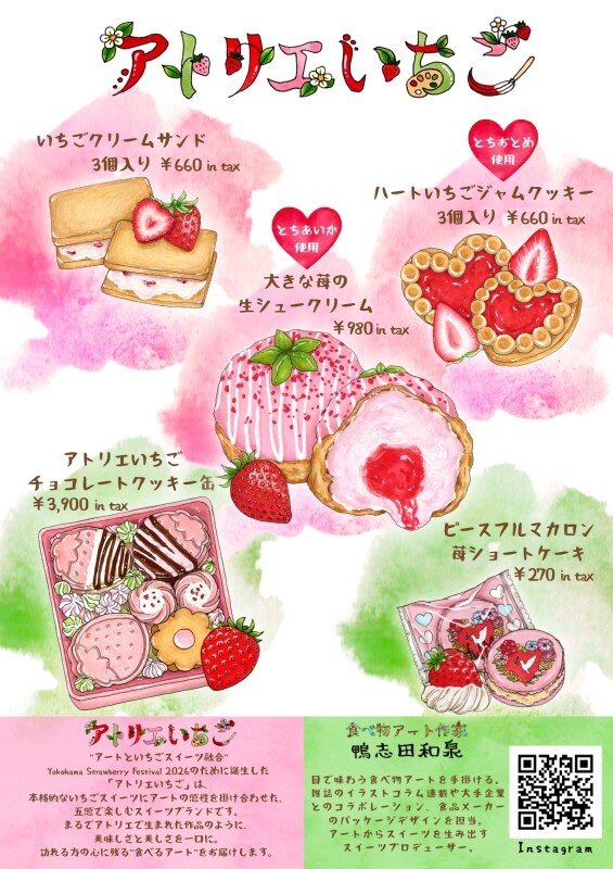 2026年開催のYokohama Strawberry Festival 2026 では、食べ物アート作家・鴨志田和泉さんが商品企画からお店のコンセプトまで、すべてをプロデュースした特別ないちごスイーツショップが登場!そのラインアップのひとつとして、ブールミッシュのピースフルマカロンも並びます。