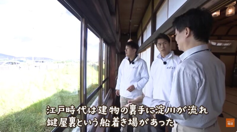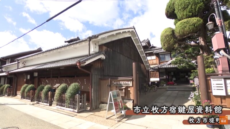 衝撃の事実にぼう然の2人ですが、気を取り直して京街道へ。かつての枚方宿に足を踏み入れます。いにしえの面影を残す、趣ある日本家屋などが並ぶなか、発見したのは「枚方宿鍵屋資料館」。江戸時代には宿屋、昭和のころには料亭として使われていた建物です。