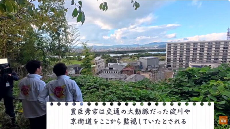 続いて2人は、枚方宿を上から眺めることができる近くの万年寺山へ。ここは1595年、秀吉が「御茶屋御殿」を建てたと伝えられる小高い丘。淀川と京街道を見下ろすここに茶屋を設け、当時の交通の大動脈を監視していたという秀吉も、2人と同じ景色を見ていたのかもしれません。