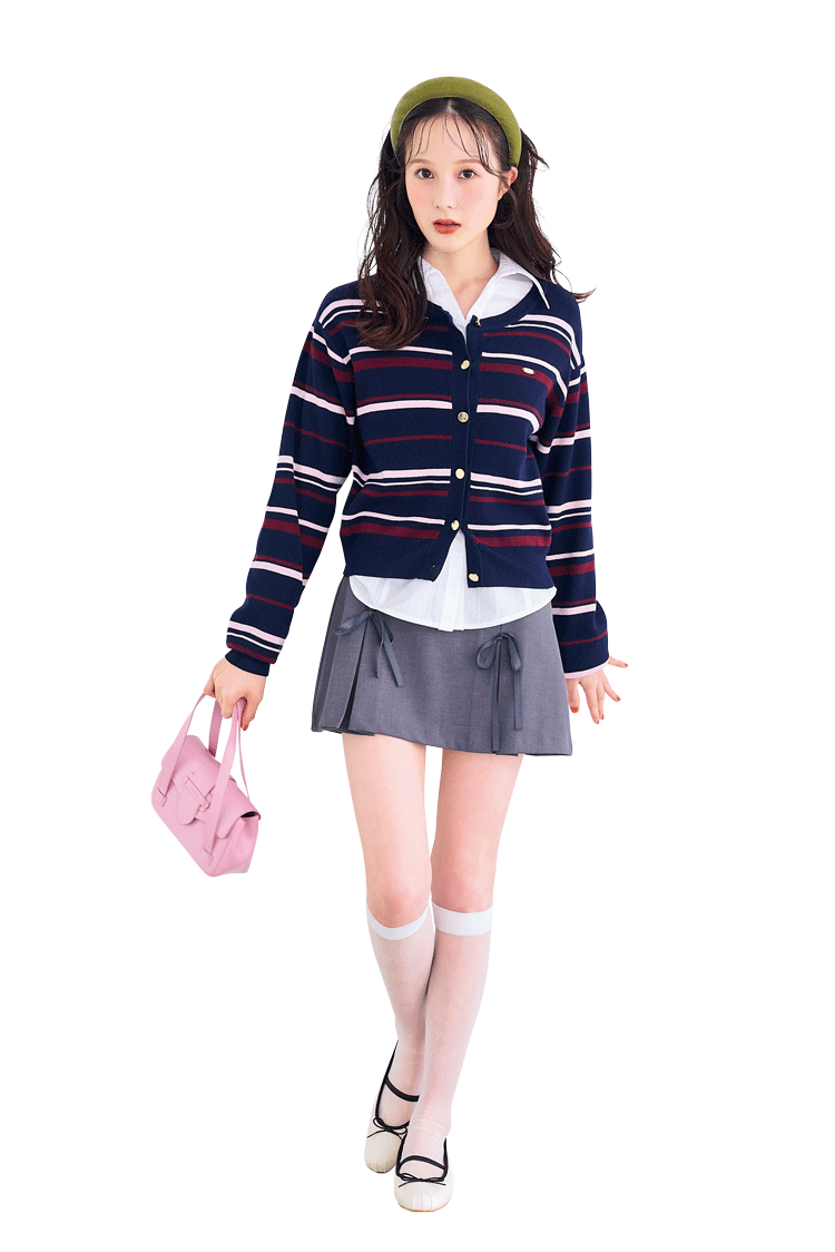 パッと目を引くカーディガンに台形ミニは作品の象徴的スタイル。