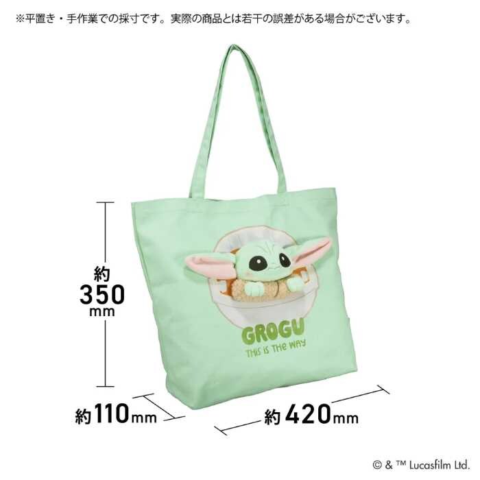 トートバッグのフロントに、グローグーのぬいぐるみを縫い付けたデザインは、視線を集める存在感。つぶらな瞳や愛嬌たっぷりの表情が丁寧に表現されており、持つたびに癒しを感じられます。