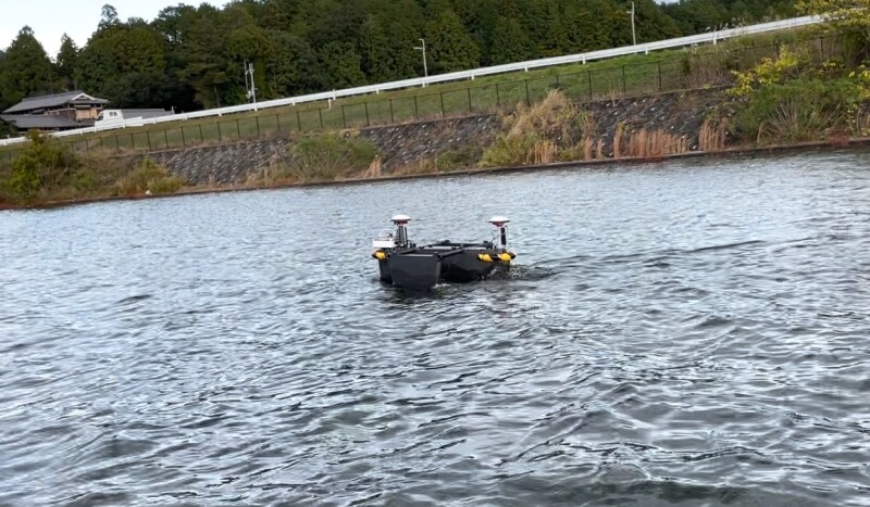 今回の実証実験で使われたのは、水面を自動で航行しながら深さを測定できる水上ドローンボートです。人が乗らず、あらかじめ設定したルートに沿って動くことで、ダム全体を効率よく計測できる仕組みになっています。
