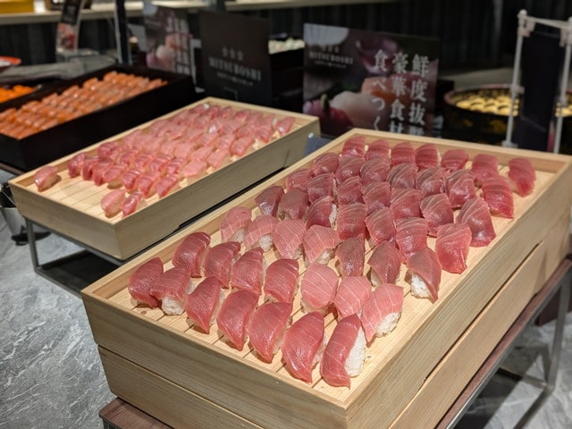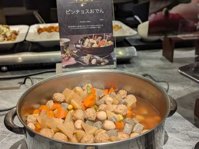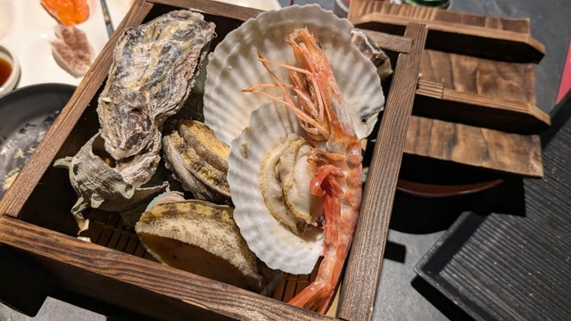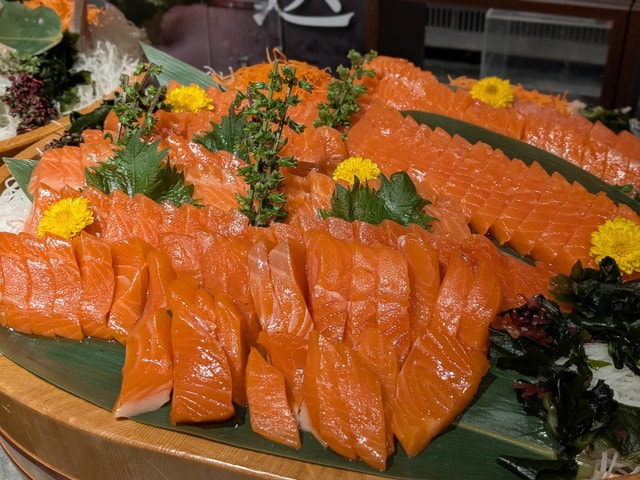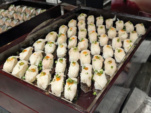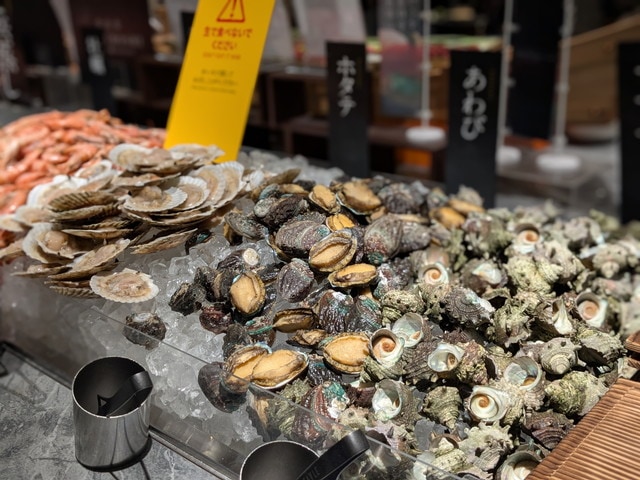 お寿司やお刺身、浜焼きなどの海鮮に加え、ライブキッチンでは出来たて料理が次々と提供され、選ぶ楽しさも満点。バイキングでありながらレストランのような満足感が味わえるのが印象的でした。