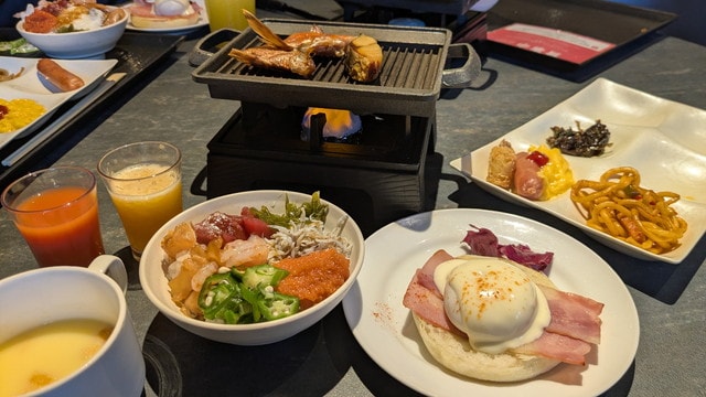 干物を焼いて味わえる和食メニューも揃っており、朝からしっかり満足できる内容でした。洋食メニューも充実していて、エッグベネディクトや焼きたてクロワッサンなど気分に合わせて選べるのも嬉しいところ。