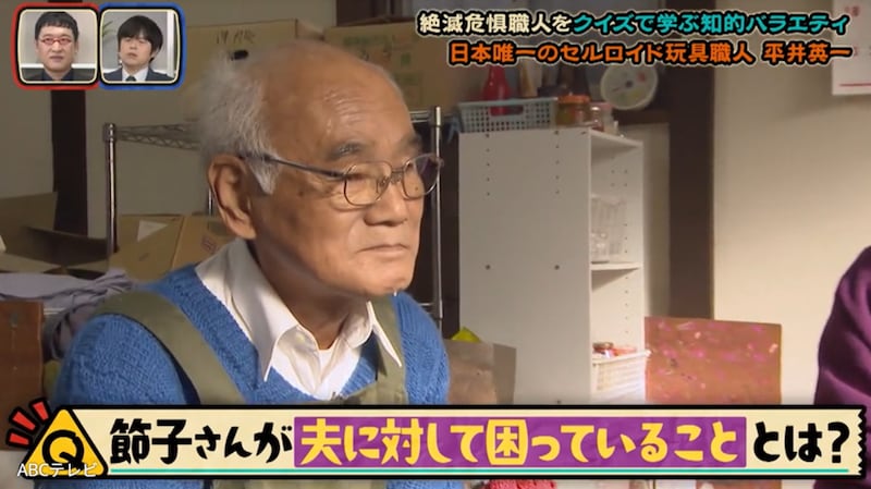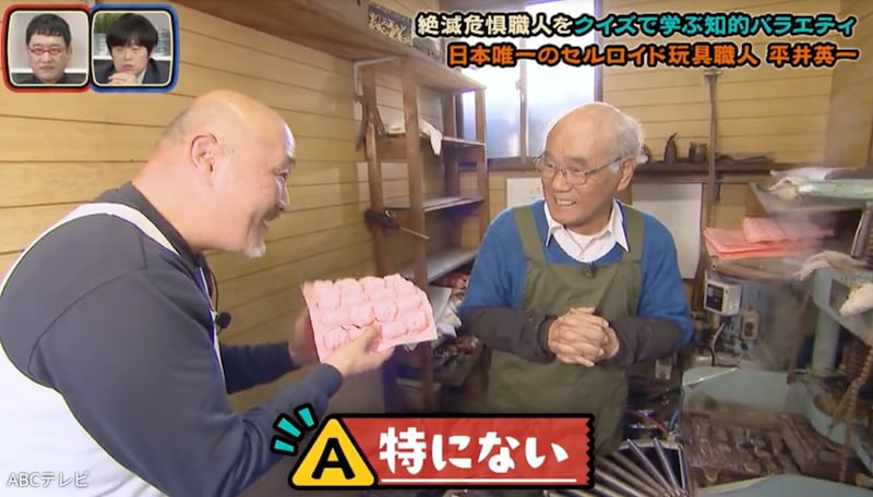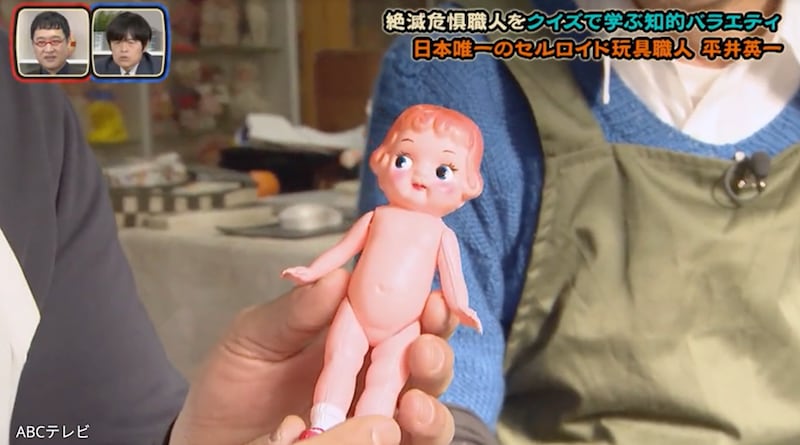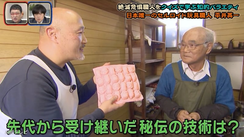 職人は、先代の父親が昭和のはじめ頃に開発した「ミーコちゃん」というセルロイド人形“だけ”を作り続けている平井英一さん。ミーコちゃん作りの工程にくまだもスタジオも興味津々だ。そして出されたクイズは、80年もの間作られてきたセルロイド人形作りで、「代々受け継がれる秘伝の技術は?」というもの。それに対するパネラーたちの解答は!?