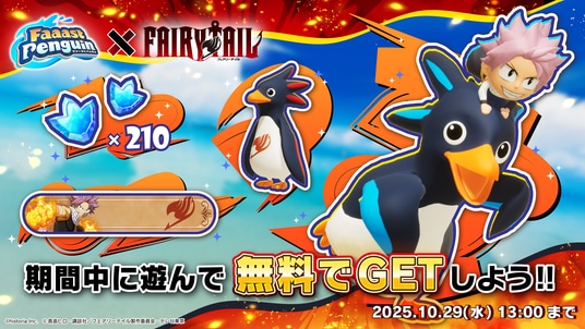 FAIRY TAILがペンギンの世界をジャック!ギルド「妖精の尻尾」の一員となり、レースに参加してさまざまな依頼をクリアしよう。突如レース中に現れるアクノロギアの討伐をプレイヤー全員で目指す協力型イベントも開催。さらに、ナツやルーシィといったおなじみのキャラクターがスキンとして登場するほか、スペシャルライド、エモート、ネームプレートなど全32種類のコラボアイテムが用意されています。